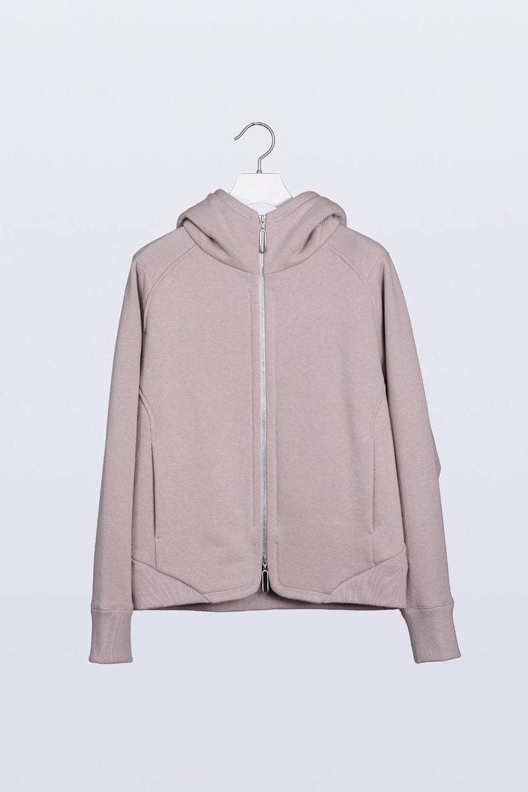 前裾のラウンドカットと立ち上がるフードの設計が、シンプルな中に確かな存在感を添える、HATRAのシグネチャーパーカ。